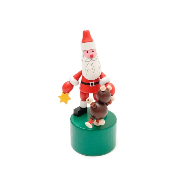 DETOA Wooden Push Up Santa&Bear チェコのDETOA社によるプッシュトイです。 土台の裏側を下から指で押すと内部に通った糸のテンションが緩んで人形が倒れ、指を離すと起き上がるギミックが楽しい伝統的な木製玩具。 ハンドペイントで絵付けされた温かみのある雰囲気も魅力で、オブジェとして飾るのもおすすめです。 ----------------------------------------- Size 50×70×123mm 素材: WOOD MADE IN CZECH (注意事項) ・ハンドメイドのためペイントやサイズには個体差がございます。予めご了承ください。 ・この商品には小さな部品が使われています。誤飲や窒息の危険がありますので、口の中には入れないで下さい。 ・小さなお子様には絶対に与えないでください。 -----------------------------------------
