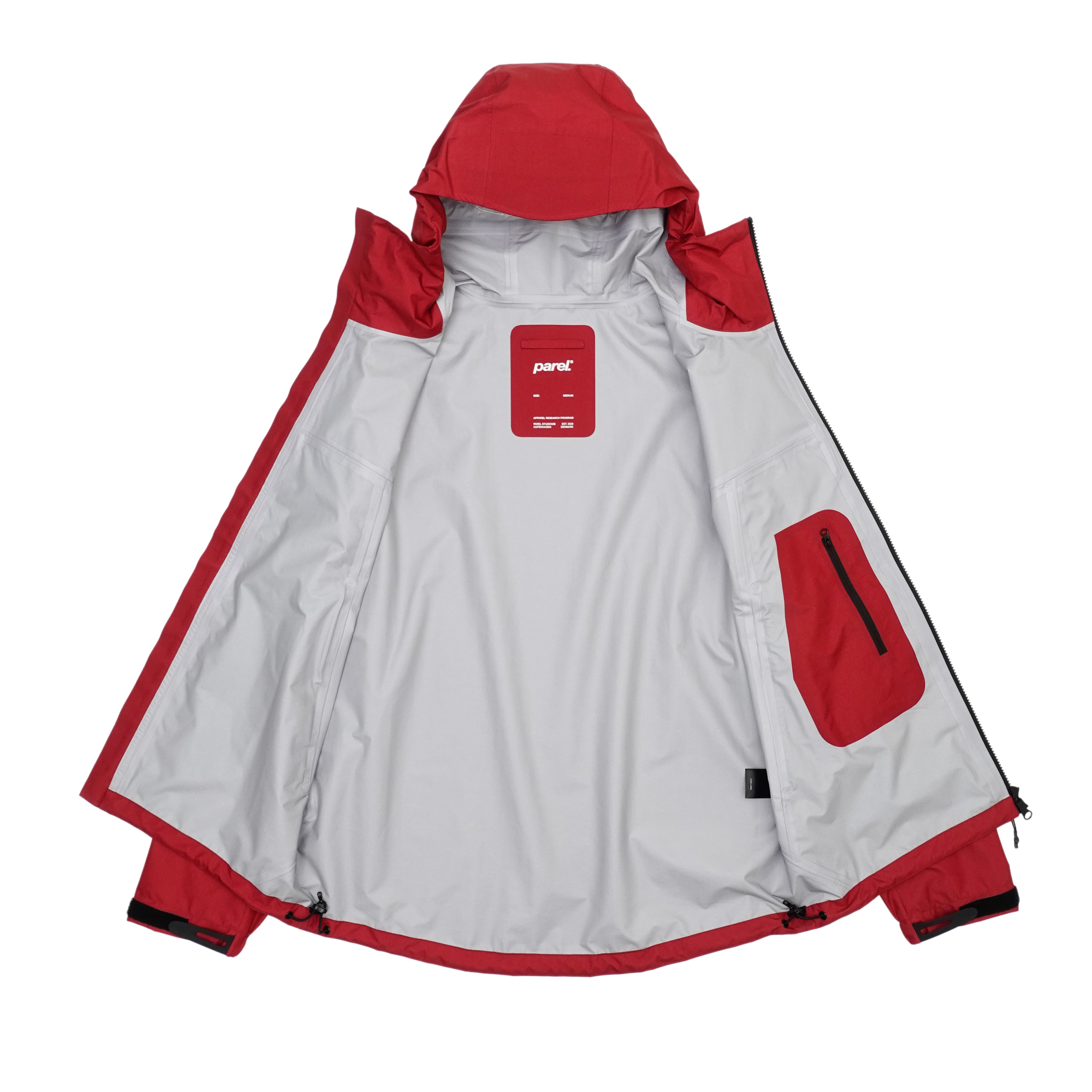 改良された調節可能なストームフード、ベルクロカフス、ウエストのドローストリングにより、フィット感をカスタマイズ可能。