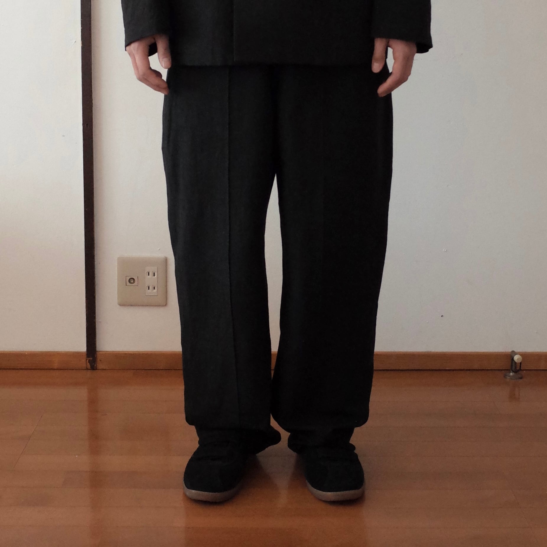 スラックスはワイドテーパードシルエット。
